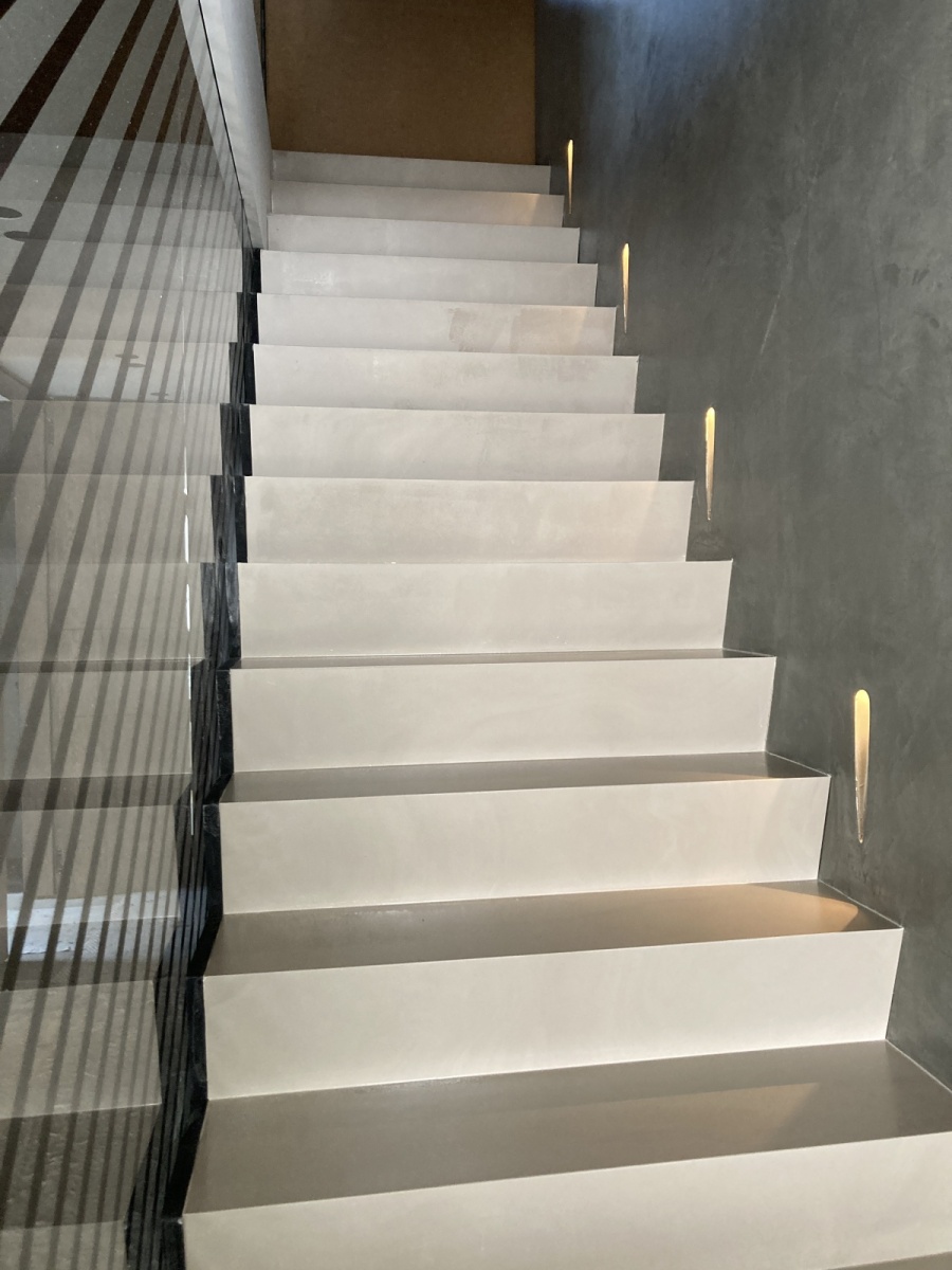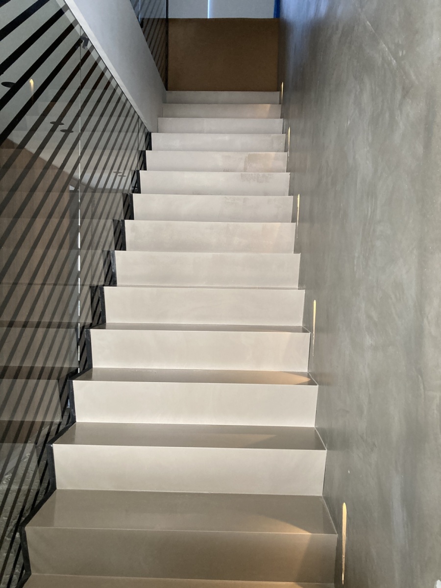 Door het samenvoegen en mengen van de twee kleuren ontstaan er verschillende schakeringen en kleurnuances in deze gietvloer. Hierdoor ontstaat er een speels effect dat vaak bestaat uit lichte vegen of vlammen.